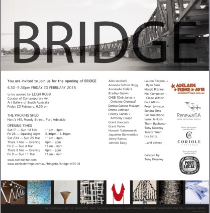 I will be taking part in BRIDGE this year, once again – part of Tony Kearney’s now legendary award winning “rust salt tar” exhibitions in Port Adelaide, part of the Adelaide Fringe.